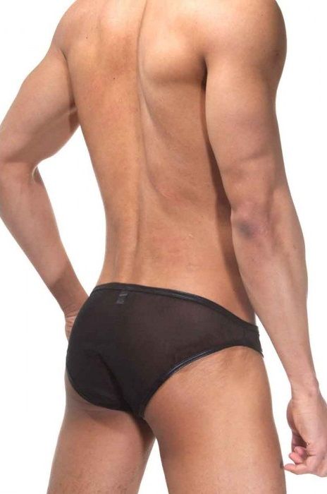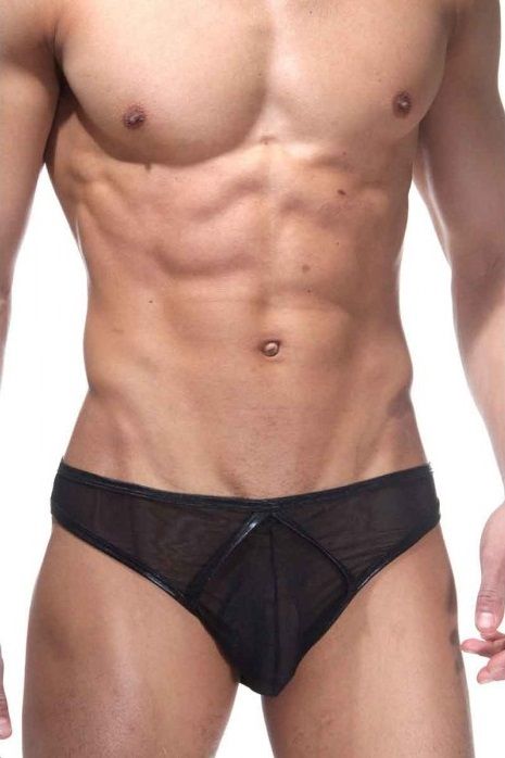 Легкие мужские трусы-слипы из черной эластичной ткани. Трусы окантованы блестящим шнуром.