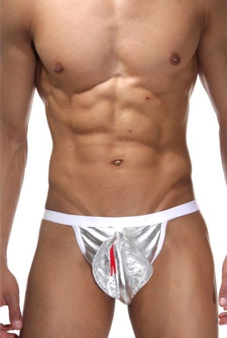 Ролевые трусы-костюм с серебристой коброй. У кобры раскрыт капюшон и торчит красный язык. Трусы-стринги на белой плотной резинке.