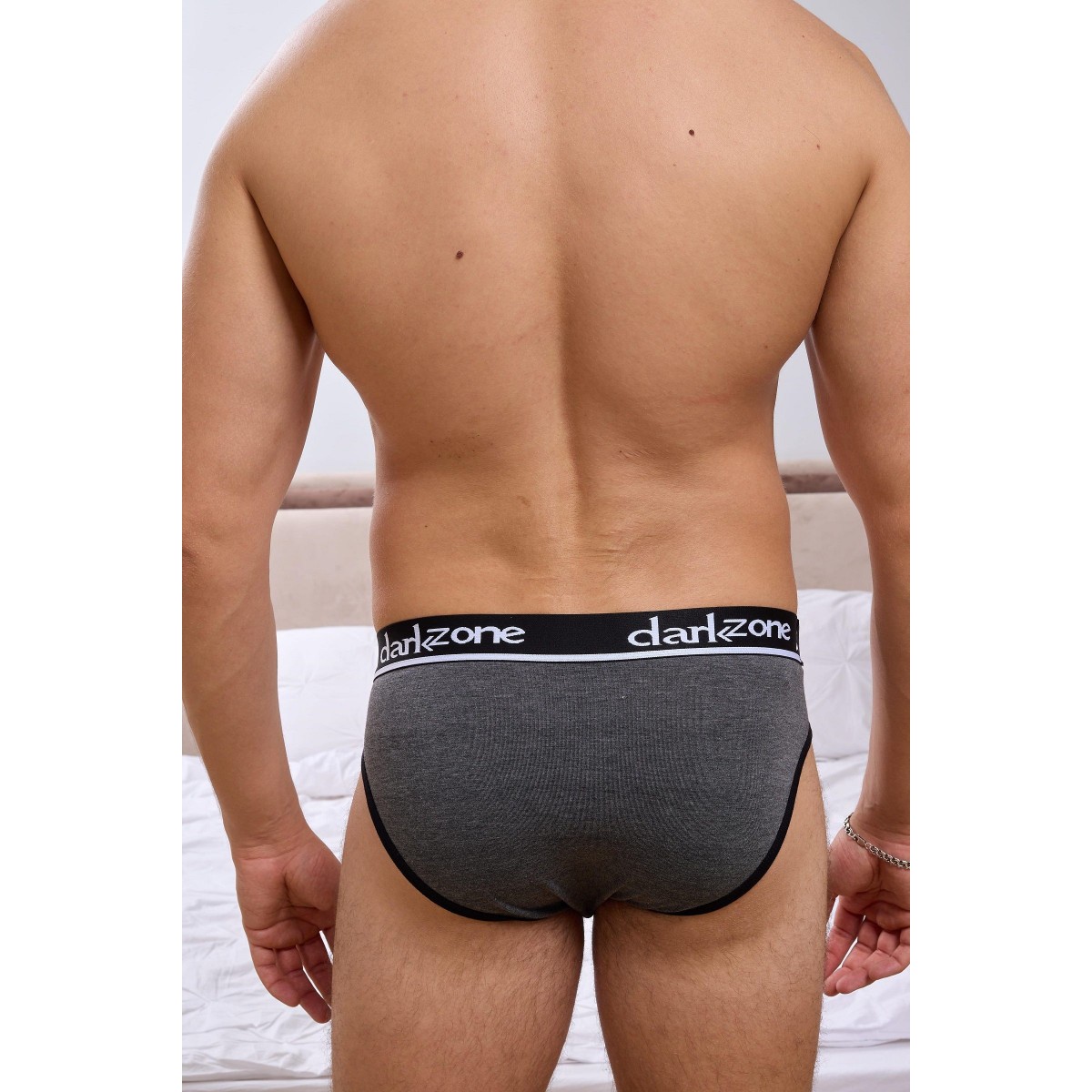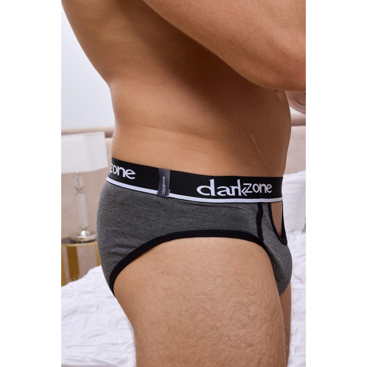 Темно-серые мужские трусы-брифы с вырезом.