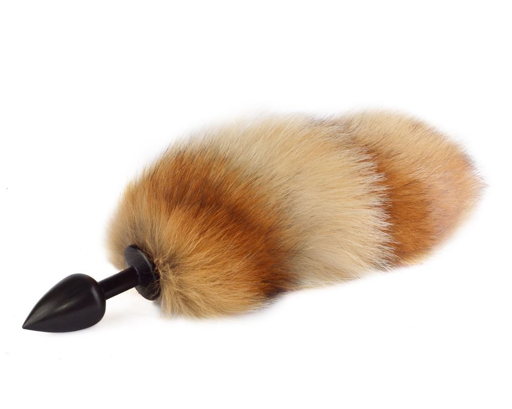 Черная анальная пробка из TPE с рыжим лисьим хвостом (натуральный мех). Длина хвостика - 20-25 см.