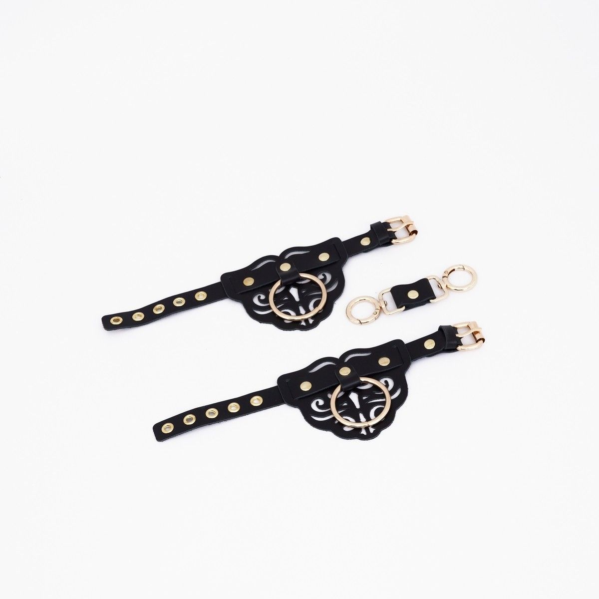 Наручники с декоративными резными узорами изготовлены из натуральной кожи. Декорированы золотой фурнитурой и клепками. В комплект также входит соединительный кожаный элемент с двумя карабинами, с помощью которого можно зафиксировать между собой руки. Доставляется в фирменной упаковке в виде брендированной деревянной подложки.