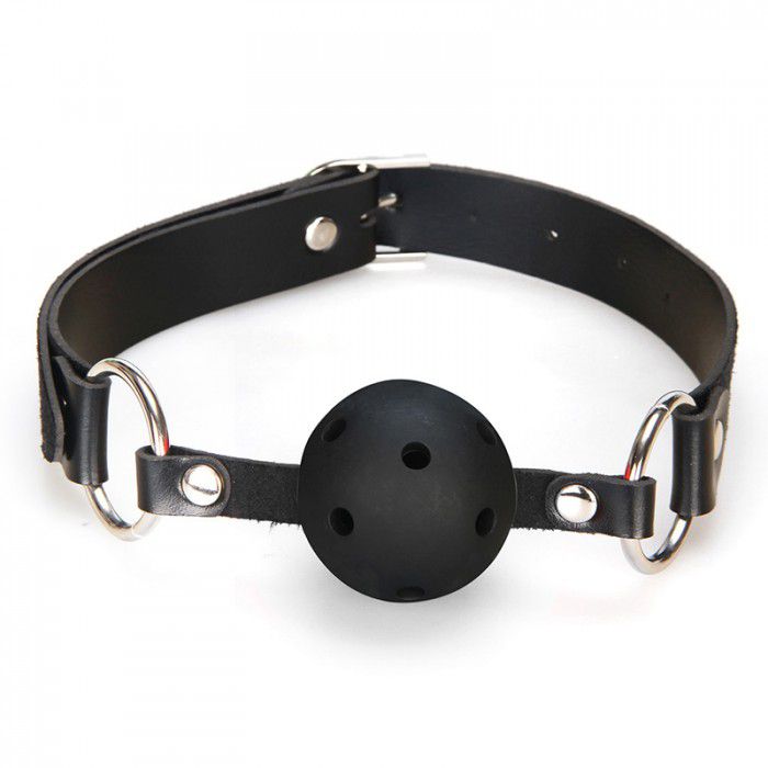 Черный кляп с пластиковым шаром с отверстиями для облегченного дыхания. Кляп застегивается на ремешок из искусственной кожи.