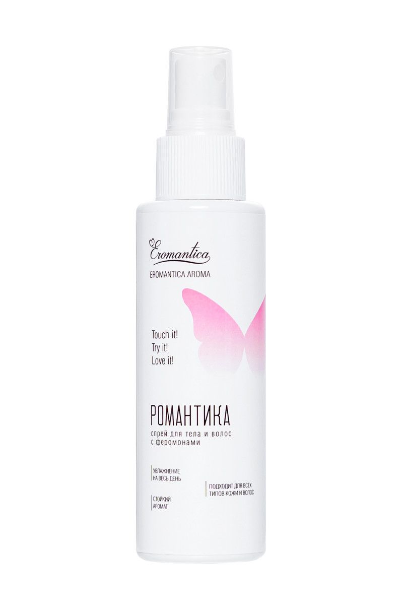 Поднимает настроение до небес, дарит ощущение легкости и очарования. Благодаря природным феромонам и легкому аромату летнего свидания ты становишься особенно привлекательной в глазах противоположного пола и чувствуешь уверенность в любой компании с новым спреем из коллекции Eromantica Aroma «Романтика». Освежает, увлажняет, тонизирует лицо, тело и волосы.