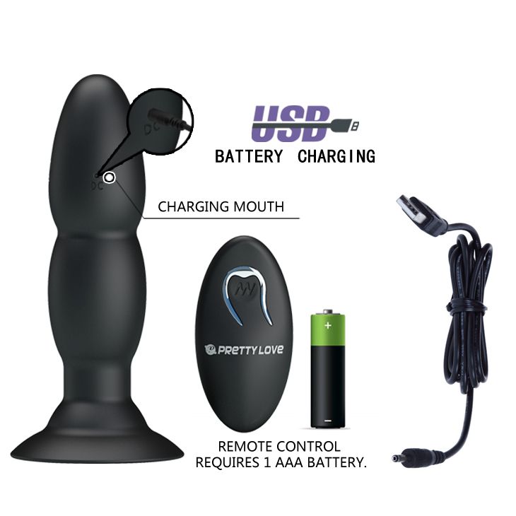 Анальная пробка с вибрацией, ротацией у основания и дистанционным управлением. 4 функции вибрации. 4 режима ротации встроенных в основание бусинок. Основание-присоска. Перезаряжаемая. Пульт работает от 1 батарейки типа ААА (нет в комплекте).
